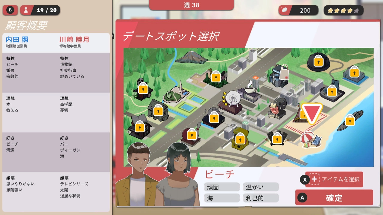 仲人になる – 顧客を分析して面接し、完璧な場所を探し、最高の贈り物を選び、デートを計画します。あなたは最高の独身男性/独身女性ではないかもしれませんが、少なくともゲームで最高の仲人になることができます。